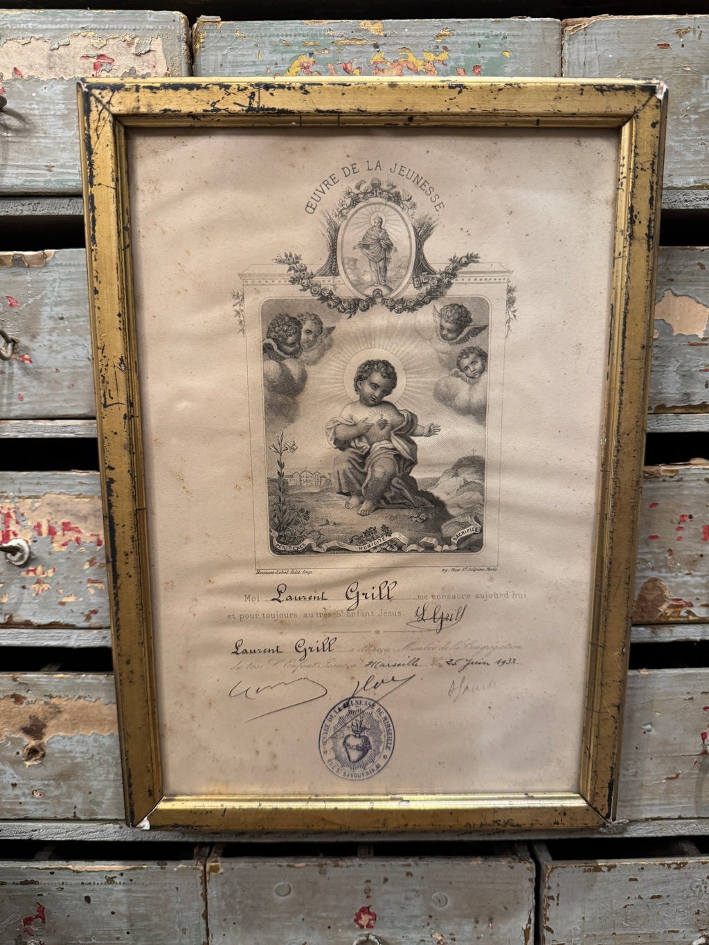 Beautiful French SIgned Dedication to Jesus Engraving - 1933